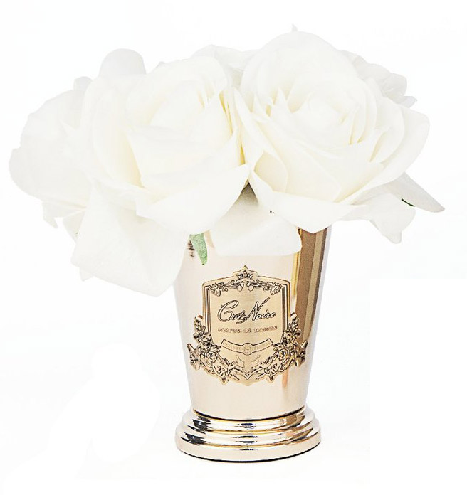 Cette composition florale comprend des roses réalistes, fabriquées à la main. Deux vaporisateurs de parfum Rose sont inclus pour rafraîchir et rehausser le parfum de votre bouquet avec de délicieuses notes florales.